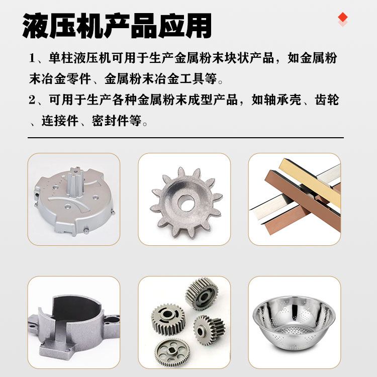 【產品描述】:單柱液壓機在冶金粉末成塊的應用以及壓制產品方面具有重要作用。在金屬粉末冶金成型過程中,單柱液壓機通常用于將金屬粉末壓制成塊狀、片狀或其他形狀的工件。